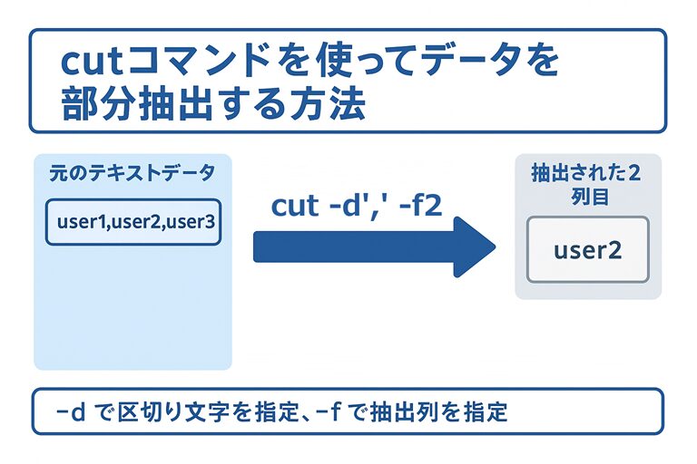 - cutコマンド は、テキストファイルの特定部分を切り出すためのコマンド。