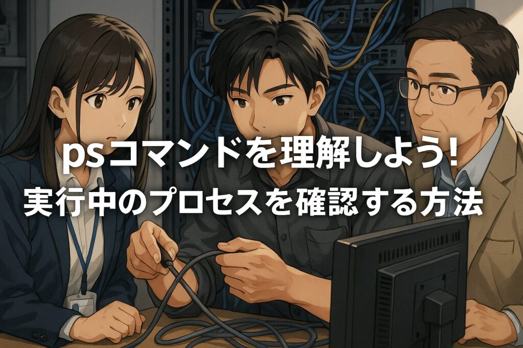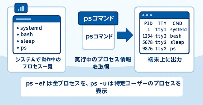psコマンドは、現在実行中のプロセスを一覧表示し、PID(プロセスID)やCPU使用率、実行ユーザーなどを確認するために使います。