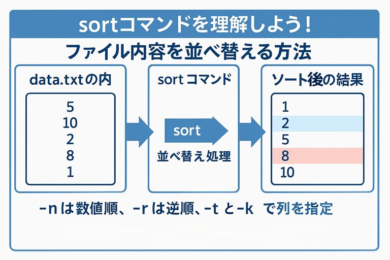 sortコマンドは、ファイルの行を並べ替えて表示するための基本コマンドです。