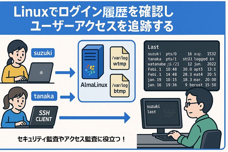 Linuxシステムを管理していると、「誰が、いつ、どの端末からログインしたのか?」を知りたい場面がよくあります。