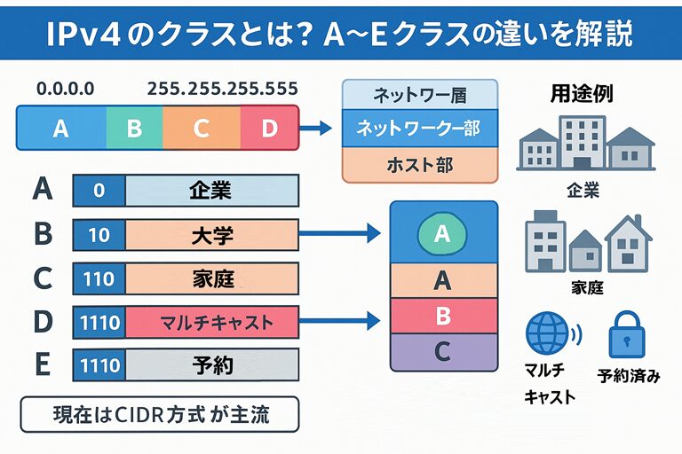 現在では CIDR(Classless Inter-Domain Routing) が主流ですが、クラスの仕組みを理解しておくことで、ネットワーク設計の基礎をしっかりと押さえることができます💡