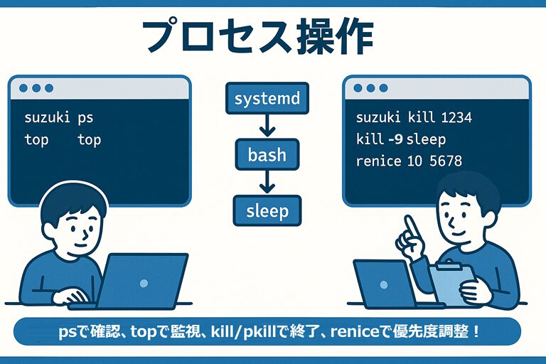 [suzuki@AlmaLinux ~]$ kill -9 2950💡 注意: 強制終了(-9)は、データ破損の危険があるため最後の手段として使いましょう。