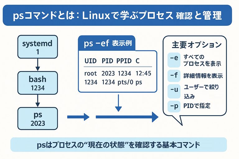 - psコマンドは、Linuxで実行中のプロセスを確認するための基本ツール。