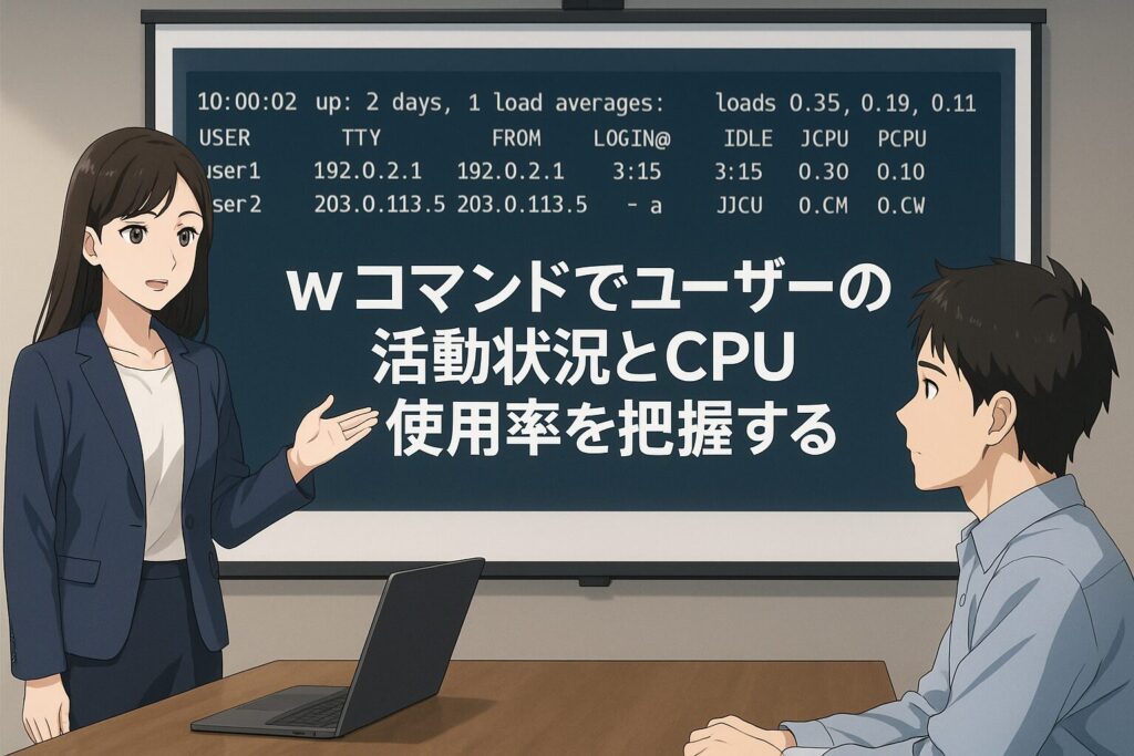 who コマンドが「誰がログインしているか」を示すのに対し、w コマンドは「誰が何をしているのか」まで確認できます。
