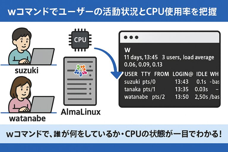 Linuxシステムを運用していると、「今、誰がログインしているの?」「どんなコマンドを実行しているの?」「CPUの使用状況は?」といった情報をすぐに知りたいことがありますよね💡