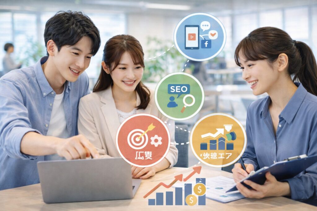 DXアップでは、マーケティング戦略、Web広告、SNS運用、SEO、Webデザインといった五つの分野を横断的に学ぶことができます。ペルソナ設計や戦略立案、広告文作成、投稿分析、キーワード選定、画像生成など、現場で実際に使われているAI活用ノウハウを、現役Webマーケターがわかりやすく指導します。AIを初めて使う方でも、基礎から段階的に学べる点が安心です。