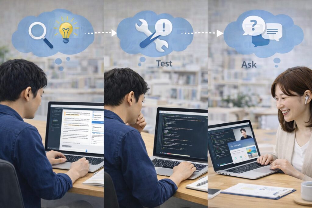 さらに、自分で調べて解決する力や、現役エンジニアに的確な質問をする力も重視されており、現場で通用する「考え方」そのものを学べる点が特徴です。こうした環境の中で、約200時間の学習を通じてエンジニアの現場に入り込めるレベルを目指します。