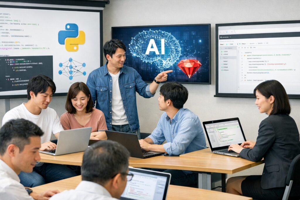 テックジムでは、Pythonコースを軸に、AIエンジニア育成コースや副業向けのRuby on Railsコースを用意しています。現役エンジニアがAI分野で案件単価を上げたい場合や、非エンジニアが業務の自動化を目指す場合、副業や起業を視野に入れてスキルを磨きたい場合など、さまざまな目的に対応できる構成です。